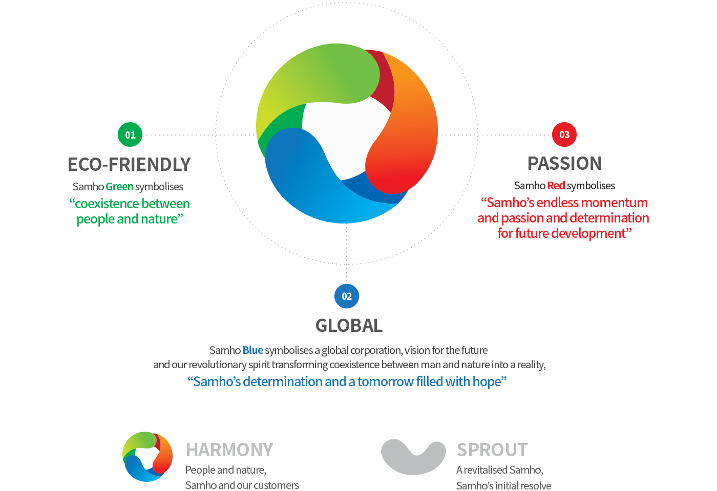Samho’s unique colour palette is not only a corporate trademark, but also an important element in the creation of our identity.