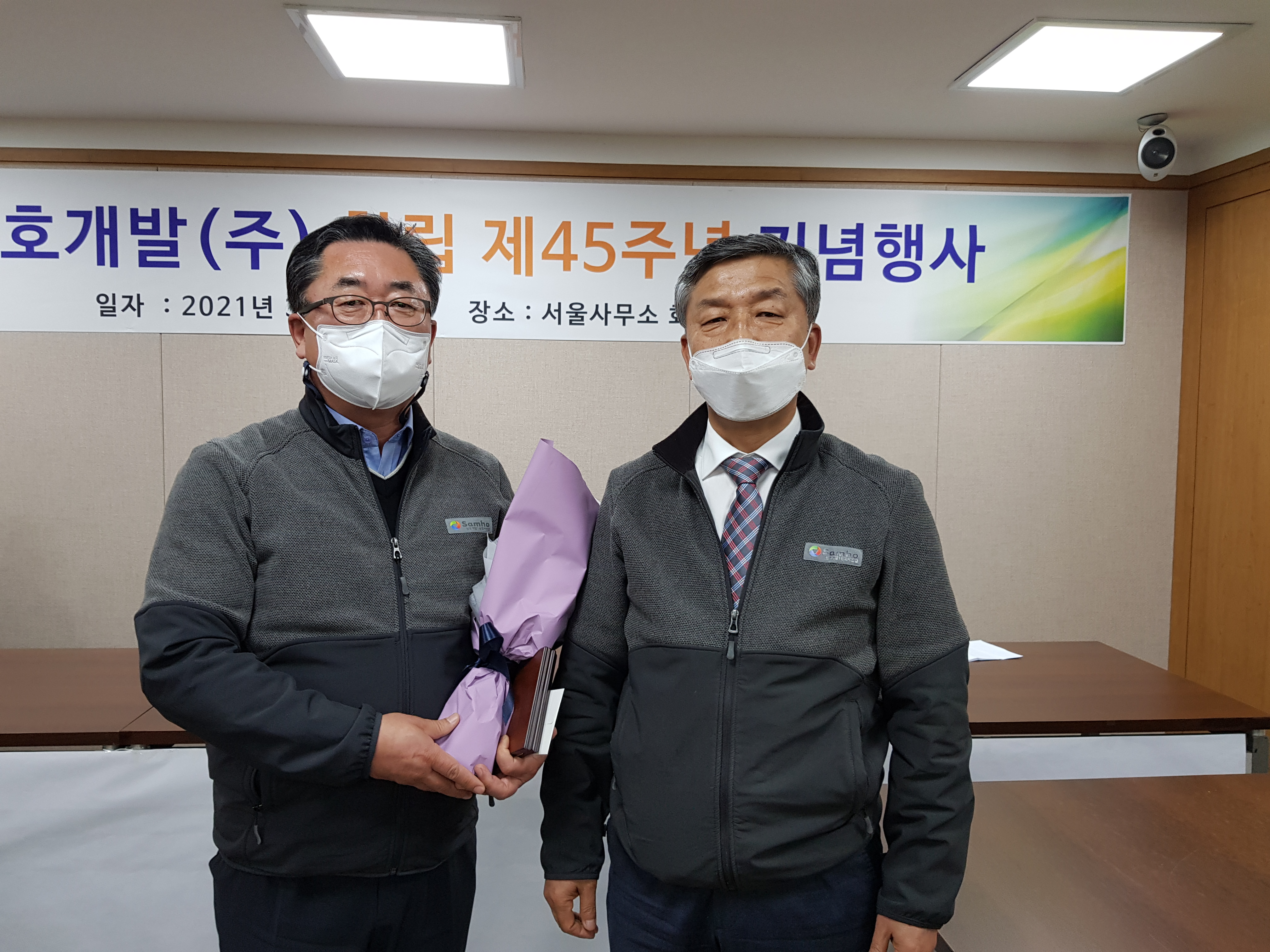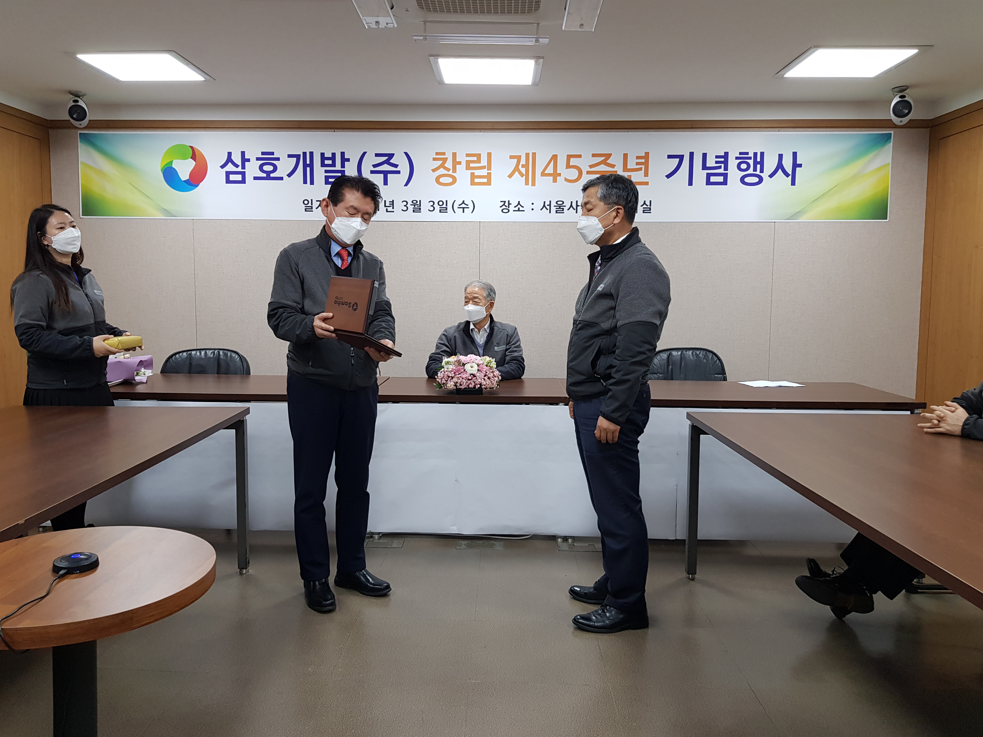 2021년 3월 3일 창립 45주년을 맞아 서울사무소 회의실에서 창립기념행사를 가졌습니다. 이번 기념행사는 코로나 19 확산방지에 따른 정부의 사회적 거리두기로 인해 최소한의 참석 인원으로 간략하게 진행하였습니다.